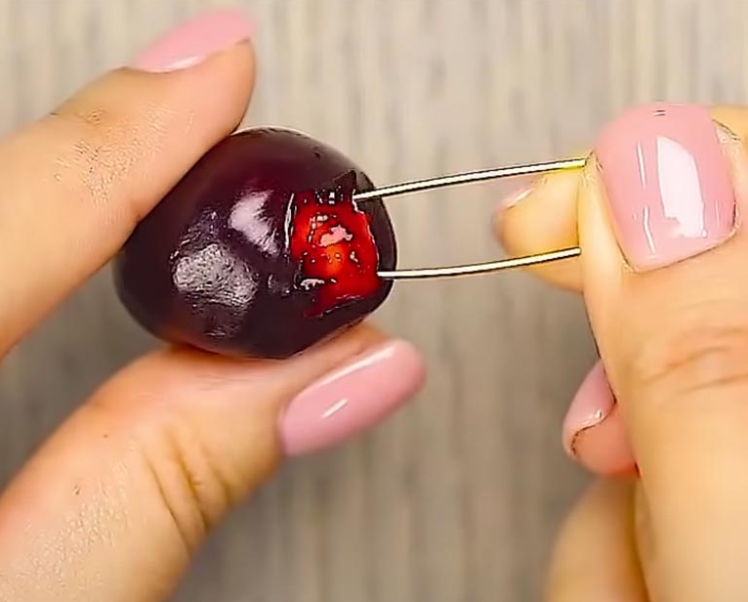 Here’s how to pit a Cherry quickly. You can use a safety pin in order to remove the pit from the red, juicy fruit. The size of the safety pin is ideal for this task and you will have clean fingers afterward! This is the best way to prepare it, for instance, for children. You don’t want your children to eat the cherries that still have the pit in them.